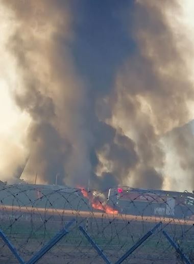 항공기가 활주로 외벽에 충돌하여 반쯤 떨어져 화재가 발생했습니다.